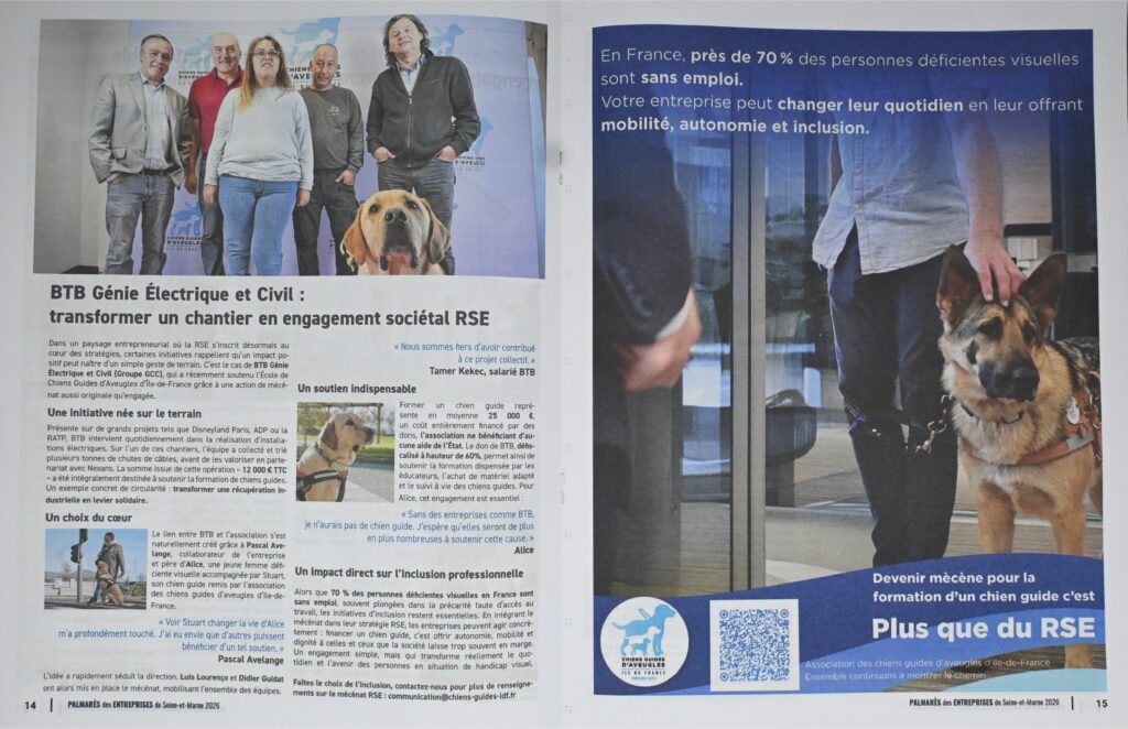 Cette mise en lumière est l’occasion de rappeler qu’au-delà de la performance économique, à travers le mécénat, il est possible de s’impliquer concrètement pour l’inclusion et d’avoir un impact réel en tant qu’entreprise tout en donnant du sens à son activité, notamment en contribuant à la formation d’un chien guide aux côtés de l’Association des Chiens Guides d’Aveugles d’Île-de-France.